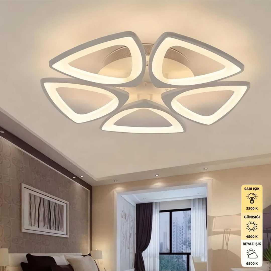 Sophia LED Avize, tavanınız için sadece bir aydınlatma değil, dinamik bir sanat eseridir. Birbirini çevreleyen beş adet soyut üçgen formun akıcı ve organik yerleşimi, mekana enerjik ve modern bir hava katar. Zarif, tamamen beyaz yapısıyla avize, tavanınızla bütünleşirken, kenarlardan yayılan yumuşak LED ışığı, odanıza sofistike bir derinlik kazandırır. Sophia, minimalizm ve göz alıcı tasarımı birleştirerek, yaşam alanınızı anında çağdaş bir galeriye dönüştürür.